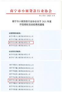 近日,南宁市小额贷款行业协会开展2021年度评选表彰活动。南宁市大都小额贷款有限公司在全市354家小贷公司评选中脱颖而出,喜获“经营管理创新奖”和“社...
