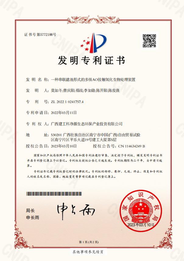 近日,公司所属广西建工科净源生态环保产业投资有限公司自主研发申请的《一种串联滤池形式的多级AO接触氧化生物处理装置》顺利获得国家知识产权局颁发的发明专利证书。